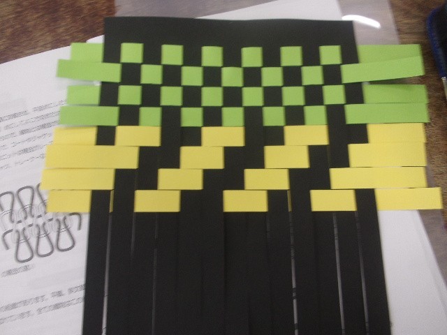 教室では、紙による織物組織実習を行いました。縦と横に短冊状の細い紙を格子状に組み合わせます。