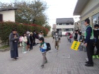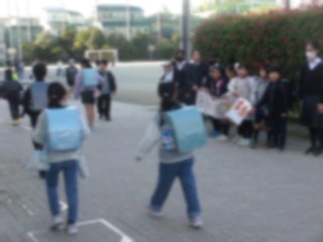 第七小学校の児童と第七中学校の生徒がそれぞれの門の側に立っています。