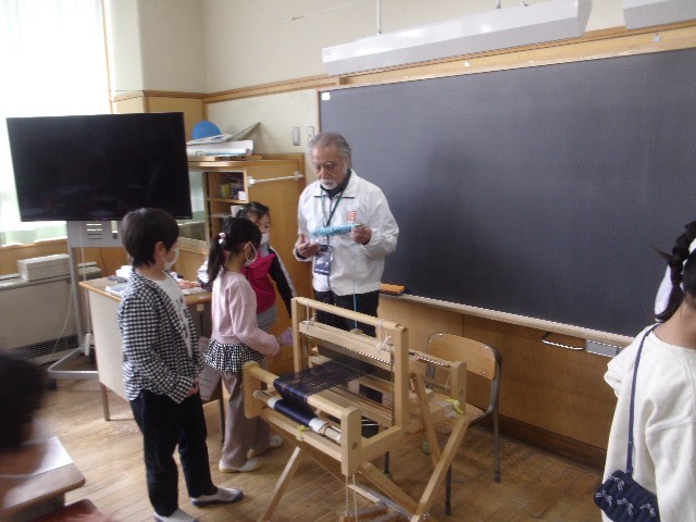 1学期、3年生の子供たちは織物組合で体験学習を行いました。本物の機織り機を操作しました。
