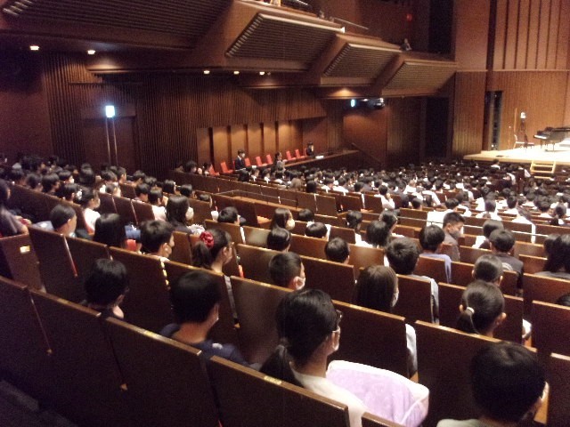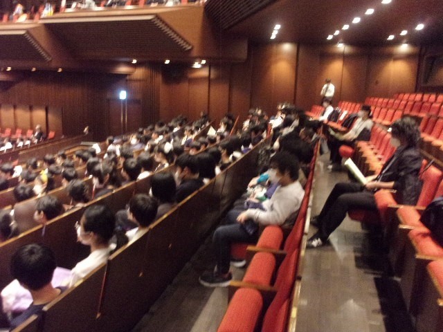 大きな会場です。第七中学校の中学生は、すでに着席しています。2階席、3階席は保護者や地域等の方々が参観されています。