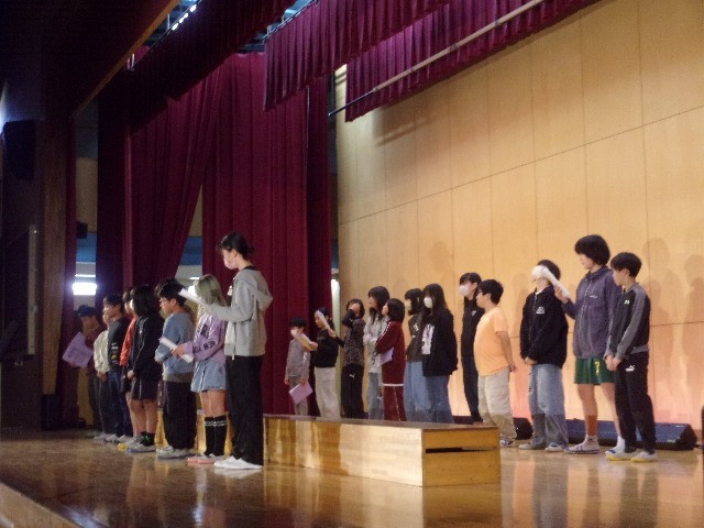 体育館の舞台の上で練習をします。第七小学校の舞台は、すごく大きいです。