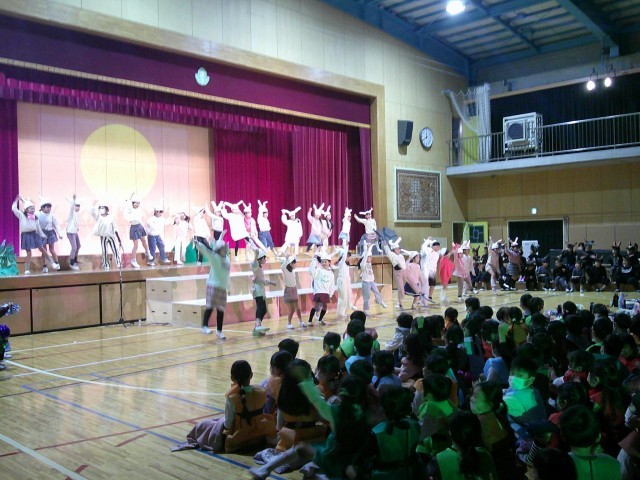 劇の最後は2年生全員で体育館をいっぱいに使って演じます。すごいです!