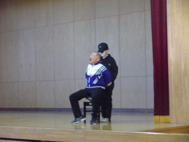 校長先生が舞台の上に連れていかれました。椅子に座らされます。