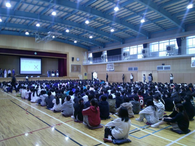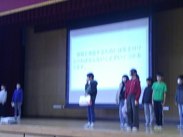 今日は特別に児童集会がありました。情報委員会による「正しいSNSの使い方」についてです。