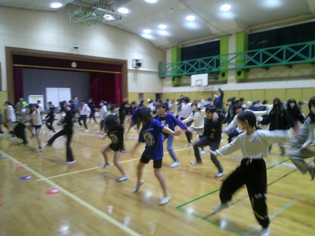 続いて第七小学校の5年生が踊ります。体育館いっぱいに広がり、かけ声を出しながら踊ります。みんな、ちゃんと覚えていました。素晴らしいです。
