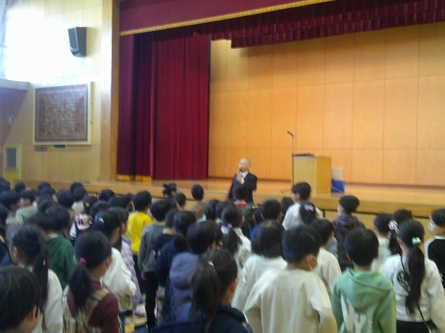第七小学校では毎週月曜日、全校朝会を行っています。今朝も体育館で行いました。