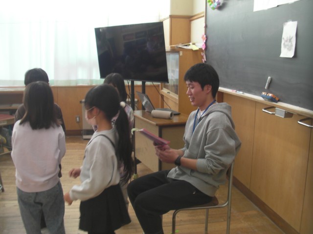 3人のインターンシップの大学生とのお別れ会です。インターンシップとは、将来、教職への進路を考えて大学生が実際の学校現場で活動する取り組みです。