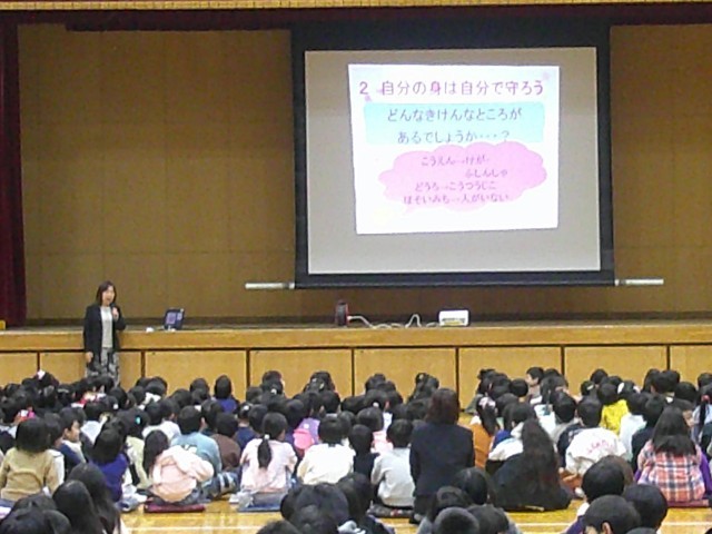 終業式が終わると、生活指導担当の先生から全校児童へ、冬休みを楽しく生活するために気を付けてほしいことを伝えました。