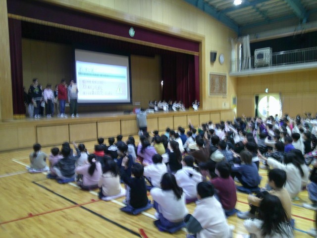 清掃に関する写真を集め、児童に身近な話題を提供しています。全校児童も楽しみながら集会に参加しています。