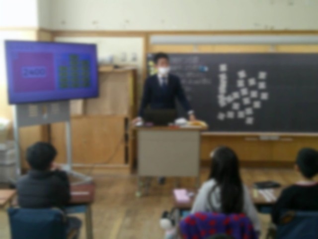 授業の初めに工夫をしています。大型液晶モニターを活用して、児童に視覚的に注目させます。
