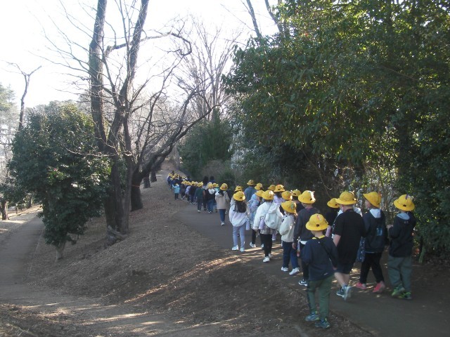 2月5日・木曜日、晴天に恵まれました。1年生の児童が富士森公園に出かけました。公園探検です。