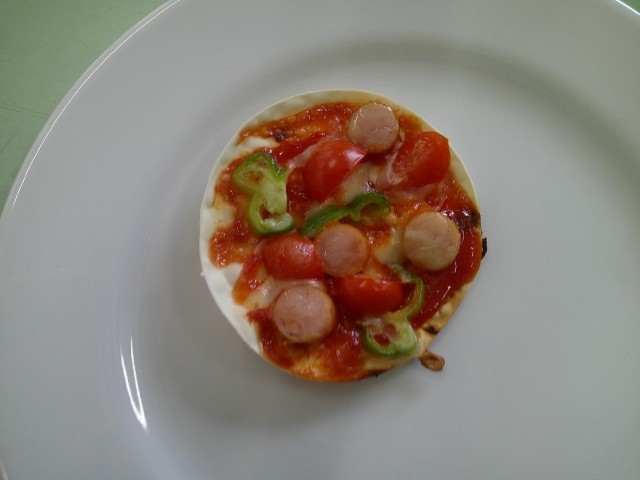ぎょうざの皮を使ったピザが出来上がりました。かわいいピザです。
