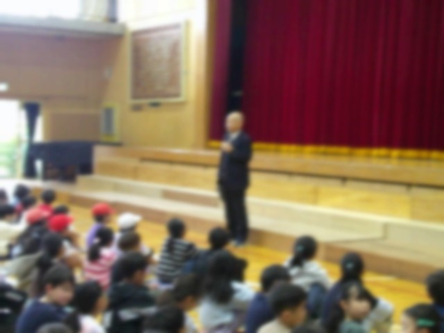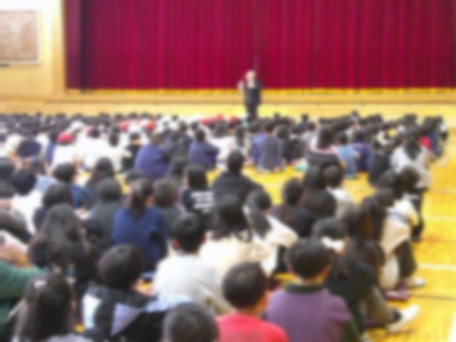 全校児童は学校長の話を静かに、真剣に聞いていました。学校長のいる方へ体を向け、学校長をじっと見つめていました。