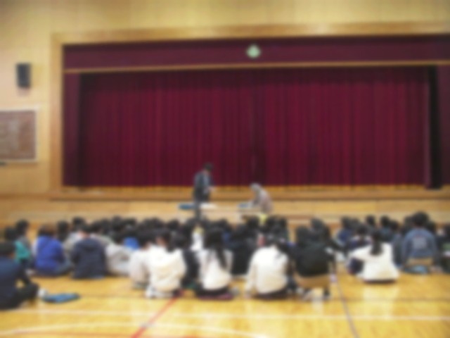 福祉体験の一環です。これまで車いす体験、高齢者疑似体験に取組んできました。今回は、盲導犬について学習しました。