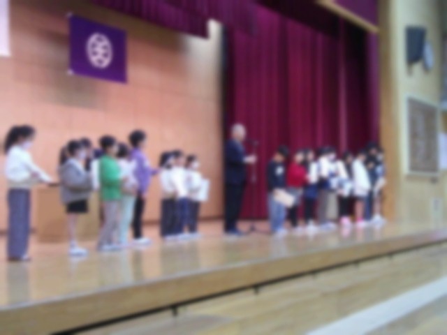 司会の先生の声が体育館に響きます。学校長から修了証を各学級の代表児童に授与します。