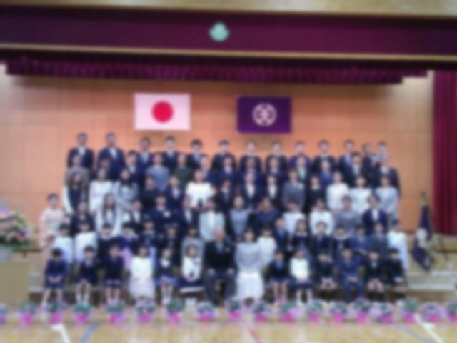 記念撮影です。学校長、担任の先生と一緒に写真を撮ります。子供たちの笑顔がすてきです。