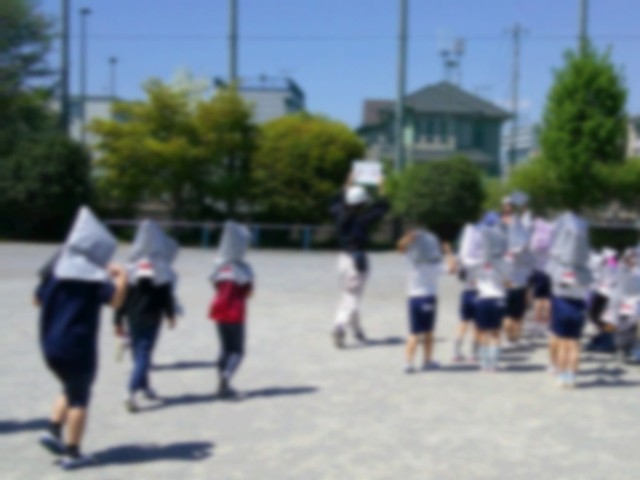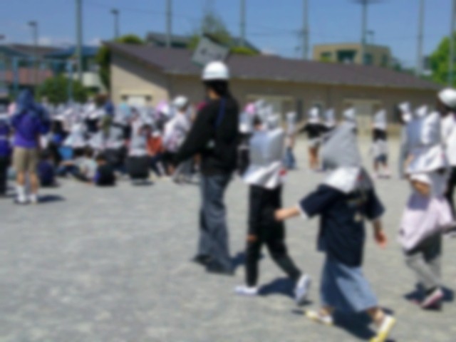 「訓練。訓練。避難訓練。第七小学校の避難訓練です。地震です。地震です。」