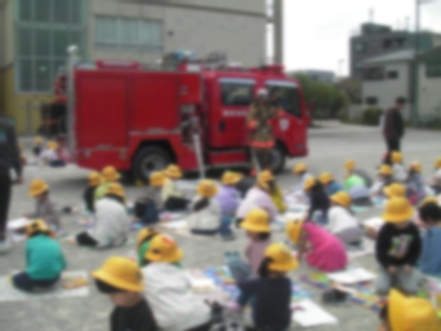 午前9時を過ぎました。校庭に2台の真っ赤な消防自動車がやってきました。かっこ良いです!