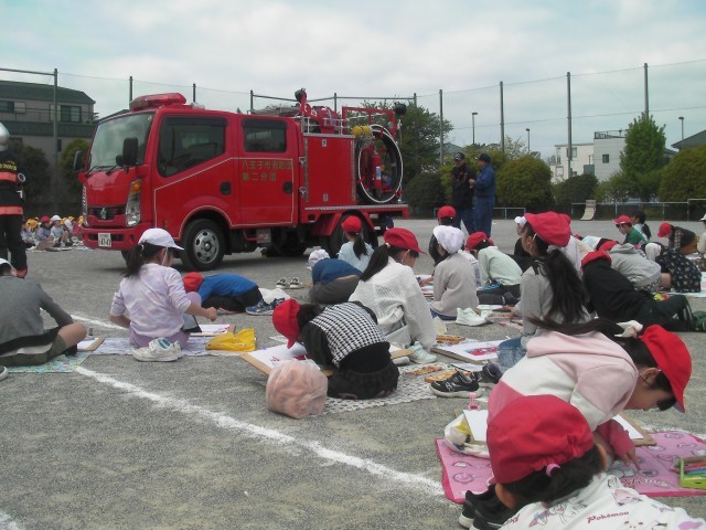 4月17日・金曜日、低学年児童が消防写生会を行いました。天気にも恵まれて、絶好の写生会日和になりました。