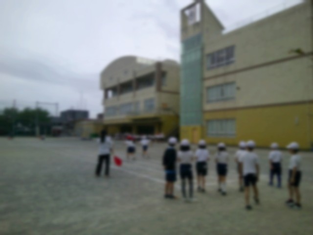 4年生の様子です。校庭で学習中です。4年生全員で体育の学習中です。
