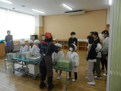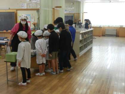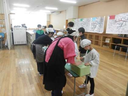 1年生の給食準備を手伝うために来てくれました。ありがとう。