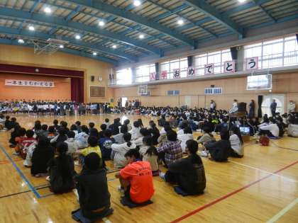 1年生が6年生と共に入場しました。学校長の話に続いて、各学年から発表のプレゼントです。