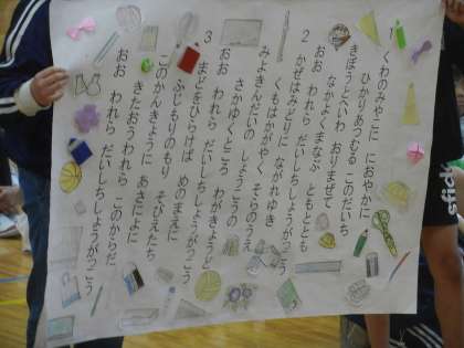 5年生です。5年生からのプレゼントは、第七小学校の校歌です。校歌の歌詞を拡大し、折り紙等で飾り付けをしました。かわいいですね。