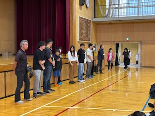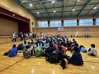 体育館の後ろや横には、たくさんの保護者の方々が見送りに来てくださっています。ありがとうございます。