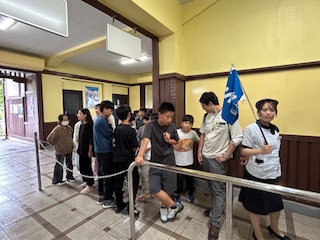 クラスごとに分かれて乗ります。エレベーターに乗ります。