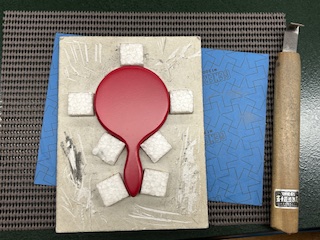 日光彫りの時間です。デザインは事前に考えてあります。手鏡、皿、フリープレートなど、様々な形の物があります。