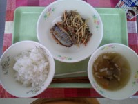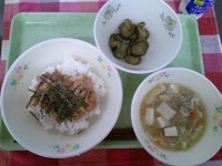 ★今日の献立★* とりごぼうピラフ* 白菜スープ* ポップビーンズ* くだもの*...