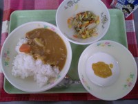 ★今日の献立★* カレーライス* フレンチサラダ* ヨーグルトのピーチソースかけ