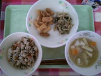 ★今日の献立★* ひじきごはん* いかの香り揚げ* ごま酢あえ* 豚汁* 牛乳