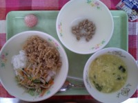 ★今日の献立★* ビビンバ* コーンと卵のスープ* まめ黒糖* 果物* 牛乳