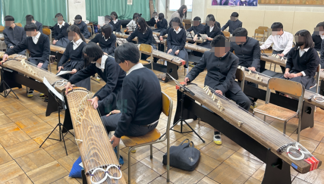 生徒たちは姿勢や構え、基本的な奏法について集中して学び、講師の本格的な指導のおかげで、芯のある箏の響きが音楽室を包んでいました。