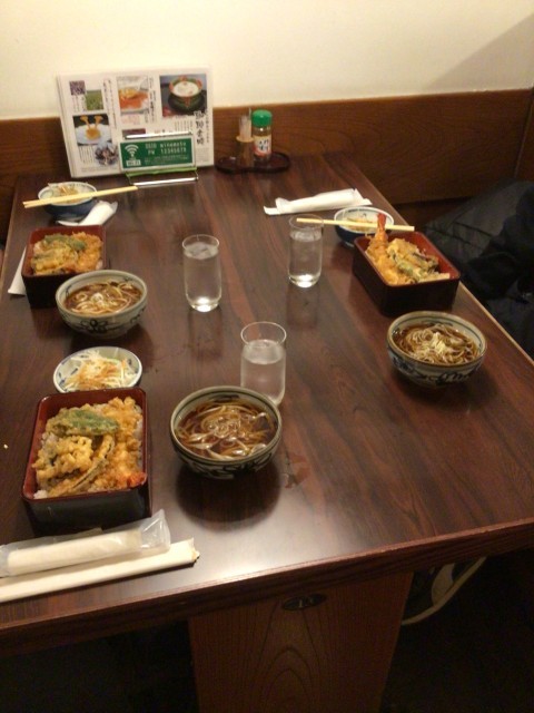 ほとんどの班が昼食を食べ終わる頃です。天丼とそば(うどん)に「めっちゃうまいっす!」と舌鼓。エネルギー充電して午後の活動も楽しみです。お店の方へ挨拶を欠かさないのも七中生の良いところです。