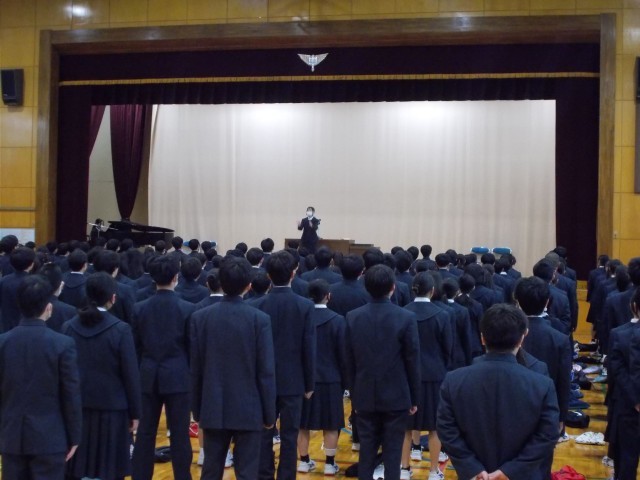 修了式、校歌の新しい指揮・伴奏ペアによる校歌斉唱から始まりました。
