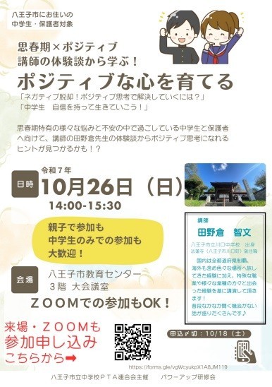 八王子市立中学校PTA連合会が主催するパワーアップ研修会のお知らせです。親子でも中学生のみでも参加できます。どうぞ御来場願います。