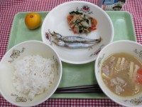 *献立*ごはん焼きししゃも豚汁青菜の変わり浸しみかん牛乳☆きょうの八王子産☆こま...