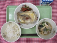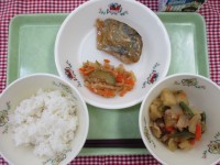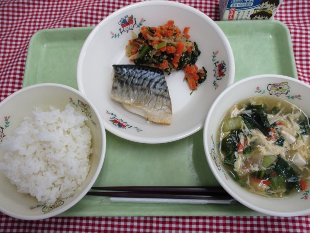*献立*ごはんさばの塩焼きかきたま汁よごし牛乳☆きょうの八王子産☆こまつな、チン...