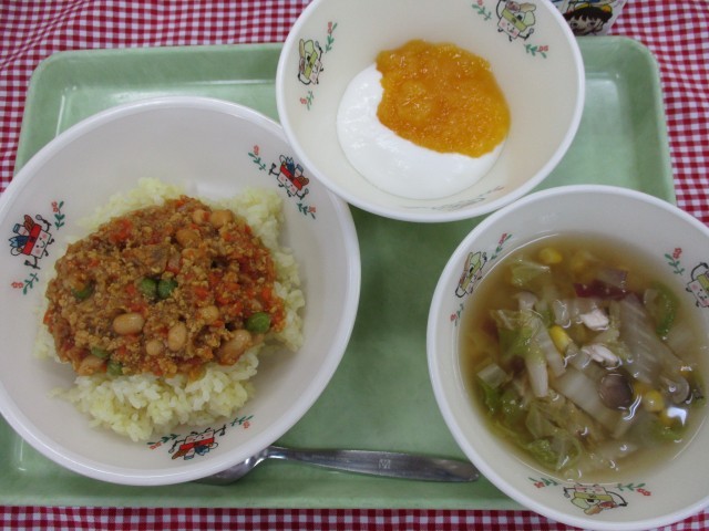 *献立*ビーンズドライカレー白菜とさつま芋のスープヨーグルトのピーチソースがけ牛...