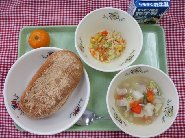 *献立*きな粉揚げパン野菜のスープ煮コールスローサラダみかん牛乳今日は人気メニュ...