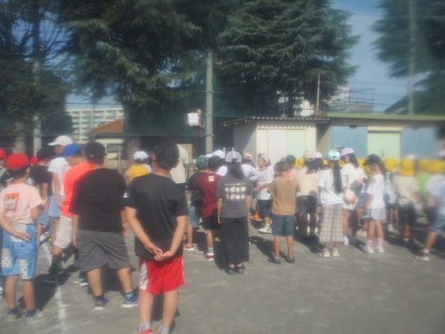9月22日(月)全校朝会がありました。この日は熱中症の指数(WBGT)の値が低かったので、久しぶりに校庭で行いました。みんな落ち着いて話を聞くことができました。