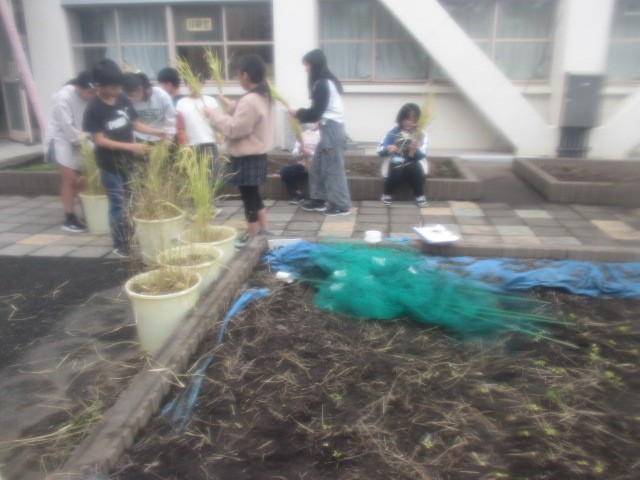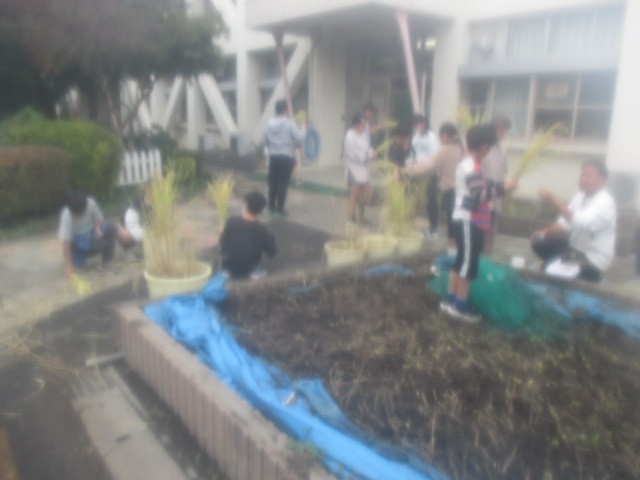 10月24日(金)5年生が、職員玄関前の畑の横で育てていたバケツ稲の稲刈りを行いました。稲は、はさみで切って収穫しました。子どもたちは、たわわに実った稲を手に取り、嬉しそうでした。刈取った稲は、教室の横の多目的室で乾かしています。