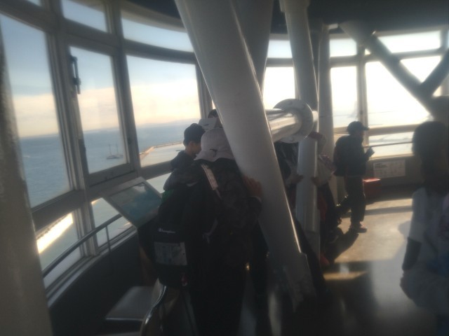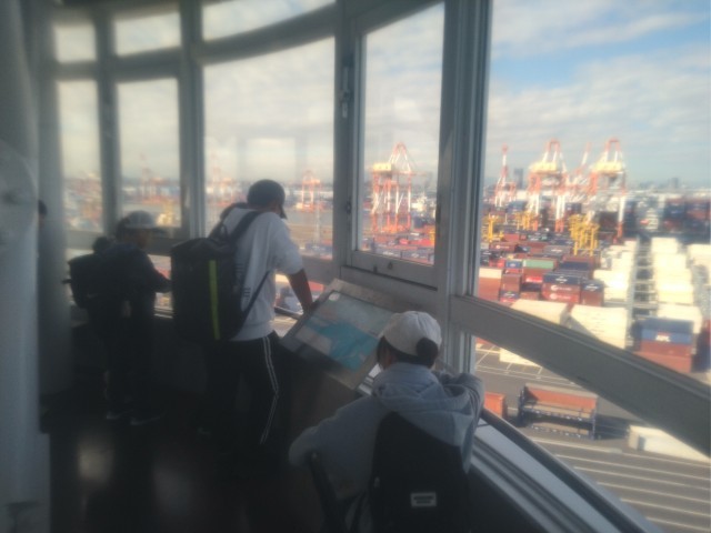 12月16日(火)横浜港シンボルタワーに着きました。港に入る船舶が通過してよいかどうかサインを送っている施設です。建物の中は登れるようになっていて、トイレを済ませた後、みんなで展望台まで上りました。展望台からは、360度の眺めが楽しめるようになっていて、望遠鏡も無料なので、子どもたちは、港の風景を楽しんでいました。