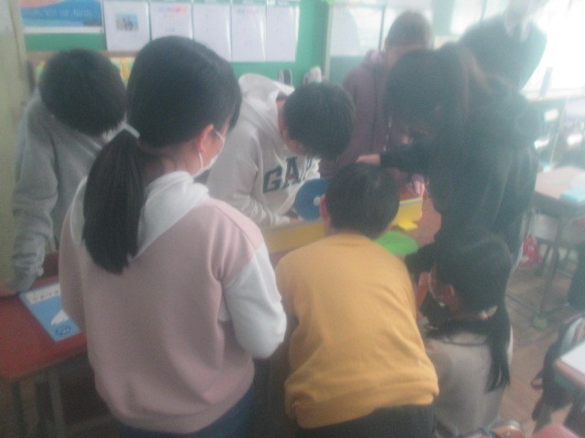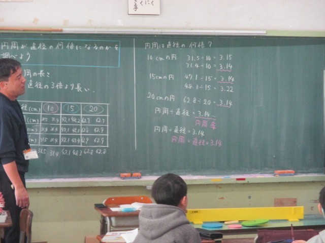 1月19日(月)5年生の教室で算数の授業をしていました。円周を直径で割り、円周率を求める授業です。円周を測る道具があり、子どもたち一人一人が実際に円周の長さを測って、3.14という値に近い数字を導き出していました。