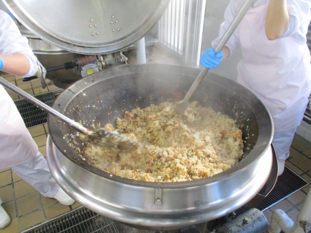 恵方巻のご飯は、調理員さんが大きな2種類のへらを使って、具材を均等に混ぜ合わせて作りました。