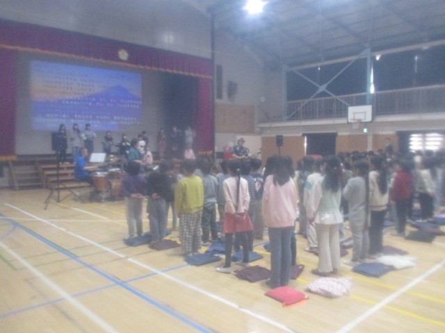 2月20日(金)体育館に全校児童が集まり、音楽集会を行いました。昨年の音楽発表会でもお越しいただいた、ギターの方を中心とする3名のゲストティーチャーの方々をお招きしました。子どもたちは、ゲストティーチャーの方々の演奏に合わせて歌ったり、踊ったり、楽しい時間を過ごすことができました。みんなで歌った富士山は体育館じゅうに響き渡る歌声でした。ゲストの皆さん、すてきな時間をありがとうございました。