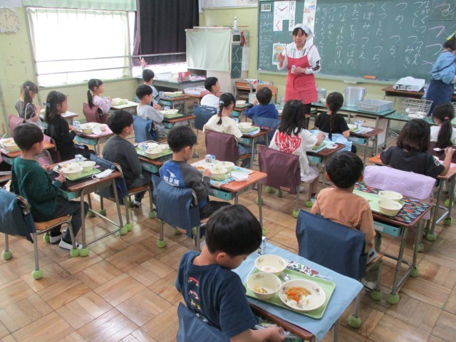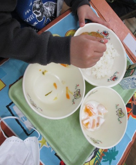 昨日の食育授業で学んだことを思い出しながら給食準備をしていました。