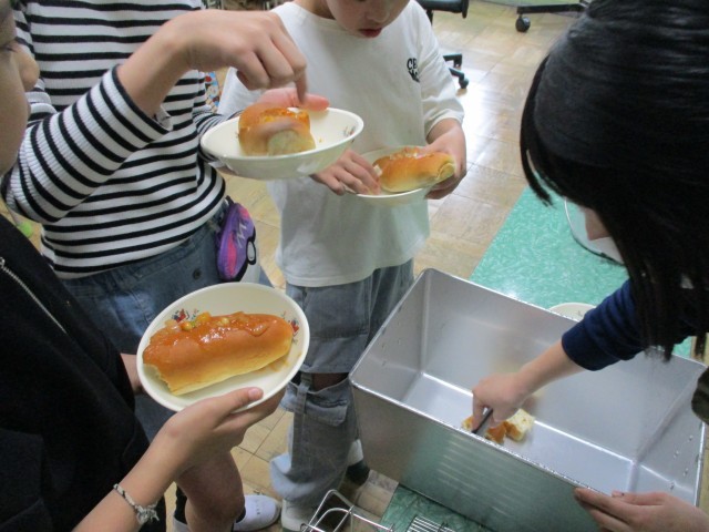 また、パンに切り込みを入れてポークビーンズを入れて、シチューパンやチリドックのようにアレンジしている子たちがおり、楽しみながら食べている様子が見られました。